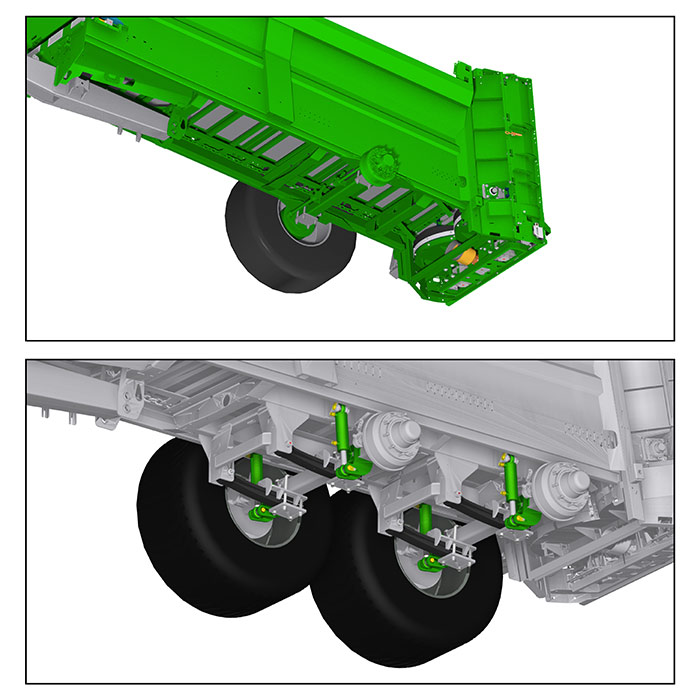 The single-axle Tornado has an oversized axle bolted under the body. it can be moved easily, which allows a perfect balance, with sufficient weight on the eyelet regardless of the chosen tyre configuration. The double-axle models are equipped as standard with a free-steering axle and a Hydro-Tandem hydraulic suspension, which ensures traction ease and optimal stability.