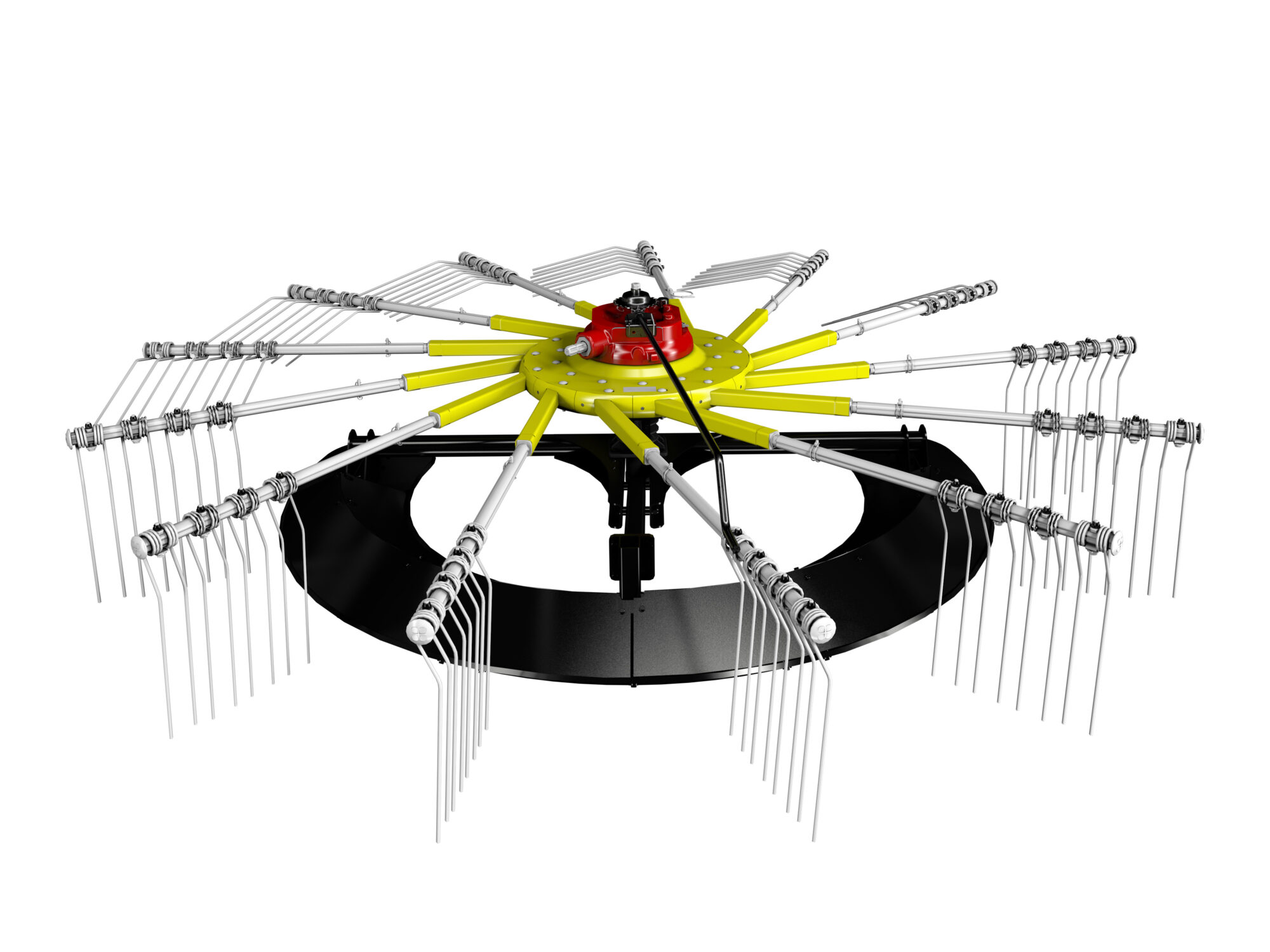 The distinctive feature of the Pottinger tines is that they pass just above the ground directly below the tine carrier at only a slight angle. even with large volumes of forage, they remain close to the ground and sweep u pall of the matter. the tines are angled forward in a dynamic position. Due to this shape, they actively lift the forage away from the ground – like a pitchfork. As more forage is collected it rides up the tine unhindered. Dirt ingress and disintegration losses are minimised as a result.